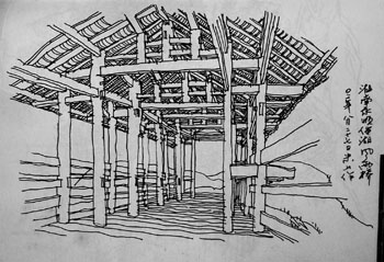 8.20小雨 旅第60天 ——今天第二个月了. 早上走了不远就到了宣恩县,修路难行,过了一个小山亚,前面是个大村子,路边有很多开山取石的农民,生态都是这样被破坏掉的,有一好象是开山的农民上来答腔我始终不理会他也就一直跟在我的后面,我说什么话也难以使他相信并且他的口音我也很难懂.在一个下坡处,雨后的泥泞使我不得不跳着前行,后来耳朵边听到一声摩托刹车声,我奋力的向旁边一跳,没有撞在我身上,但是身后的两个人却来了个俯冲人摔在了泥窝里,摩托车也将后视镜摔掉了,前边的油表处的塑料也摔掉了一块,我吓坏了赶快上前道歉,但是他们暴跳如雷,要将身份证压在这里让我给买一个去,我刚要辩解那大个字男的不由分说就踢了我一脚,我辩解说不是我一个人的错啊,他就有打了一巴掌,村民也围上来拉住他们,要不是在异乡我真的要跟他们拼了,忍了忍后来赔了15块钱了事,心里窝了一肚子火没,赶快走了,后来他们从后边骑摩托从身边经过还骂骂咧咧的,有走了1里路见他们在路边小溪里洗摩托,没有停留赶快走远了,生怕他们追上来,无缘无故被打心里别提有多难受了,这两天的运气太糟糕了.好在没有被车撞到,不然就麻烦了,行到209国道1995公里的地方休息,晚上就睡在路边的一个小棚子里,可能是农民看庄稼用的,还有草席可以睡真实太舒服了,白天的不快伴随梦乡远去,今50里.8.21阴转晴 旅第61天早上眼前有一大山,经过2个小时便翻过了山,在下上的盘山公路上看下边田野纵横山林优美,鸟声婉转,在下山途中发现一瀑布从山顶一泻而下非常壮观,但是没有时间画只好下山,40分钟便下到山脚下有一小村风景优美好似世外桃源,见一溪流将臭烘烘的衣服在河里洗了,将实在不能再穿的楔子扔掉了换上带的另外一双鞋,进入村子,竟然是一个古色古香的村子,有一条小巷子,青石板铺道两边全是老的木结构建筑,是典型的土家族吊角楼,在画速写的过程中,在一造型别致的门楼里走出一好象干部的老者,打着哈欠搬张椅子坐在门前,一会儿发现了我在画画就走上前来和我说话,言谈举止不象老百姓,后来我聊到他门前的对联以及书法, 他就来了兴趣,他问我河南那边当官的怎么样老百姓等生活怎样,我一句;天下当官的一般黑.使他大有遇到知己之感,马上说到他家吃饭,我推辞不过就去了,经过古老的过廊到客厅落座,正好赶上土家族的重要的一个节日好象是敬土地的类似汉族春节的日子,一会摆上一桌丰盛的饭菜,还来了几个他们的亲戚,席间,和蔼的老奶奶不断的劝窝吃饭,老大爷也很亲热的把我待为上宾,完全不象其他人那样看不起人,老人是一个热爱对联的人,曾经当过小学校长,在北京的楹联杂志上有很多对联发表,饭后还洗了个热水燥台舒服了,在洗澡时我想了句对联: