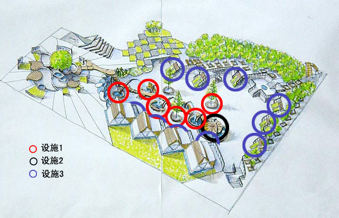 我现在觉得吧,咱学生就是卖个想法,没有必要做的很实在,设施2就是给人一种感觉,和雨伞相反的,很新鲜的感觉。要是真的要做出来,肯定要找施工的人来改了。设施1由于水平有限,表达的不好,具体作用就是可以坐在水边休息,位置在这里。。
